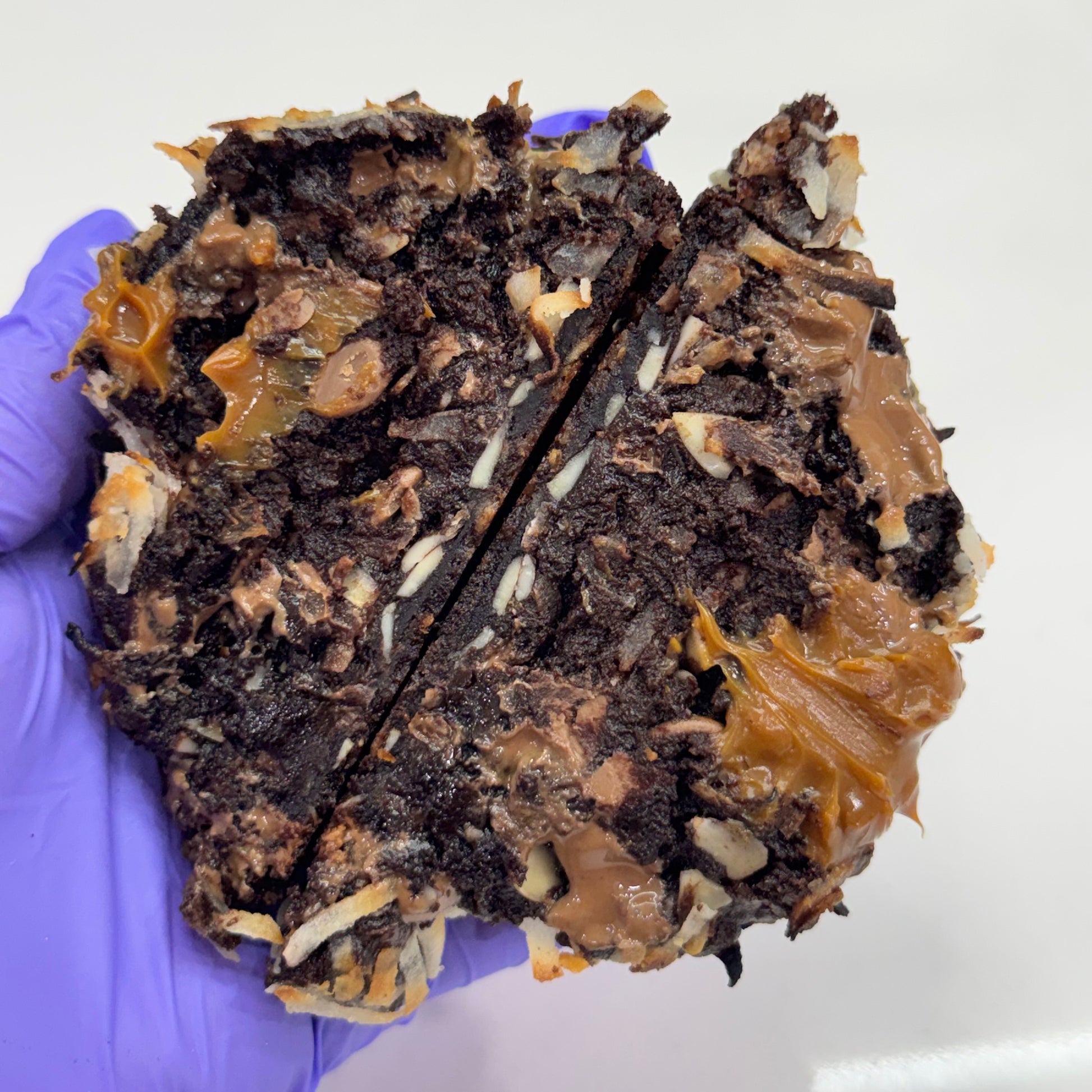 A rich chocolate cookie loaded with creamy milk chocolate chips, crunchy sliced almonds, and golden toasted coconut stuffed with smooth dulce de leche for the perfect gooey center.